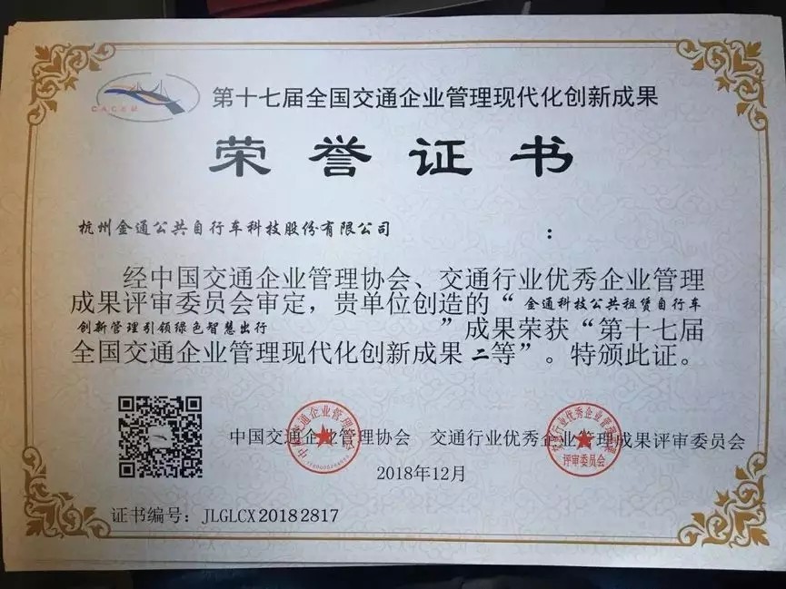 2019年3月14日,中國交通企業管理協會在山東濟南市召開了“第十七屆交通企業管理創新年會”。會上公布了第十七屆全國交通企業管理現代化創新成果和示范單位,并對獲獎單位和主創人進行了授牌,金通集團提交的《金通科技公共租賃自行車創新管理引領綠色智慧出行》榮獲第十七屆全國交通企業管理現代化創新成果二等獎。